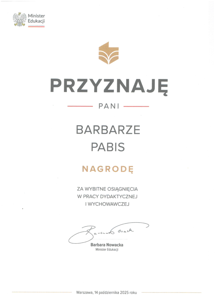 Serdecznie gratulujemy naszej koleżance Nagrody Ministra Edukacji